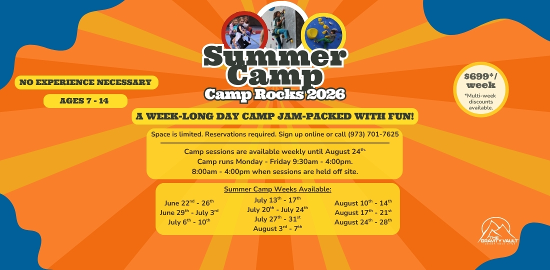 The Gravity Vault reserves the right to cancel a week if enrollment is below 10. If an outdoor climbing day must be canceled due to weather, the day will be spent indoors. There will be no make-ups or refunds if an outdoor day is canceled due to inclement weather.