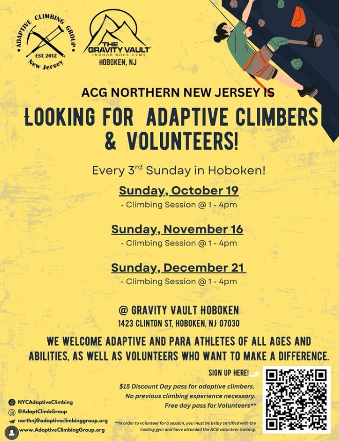 Hoboken, NJ Back to "Hoboken, NJ" Home Bookings & Subscriptions Options to Climb Pricing Calendar Contact Photos Careers Waivers Sunday, October 19, 2025 1:00pm ~ 4:00pm Adaptive Climbing Group Meetup! Hoboken, NJ Back to Events