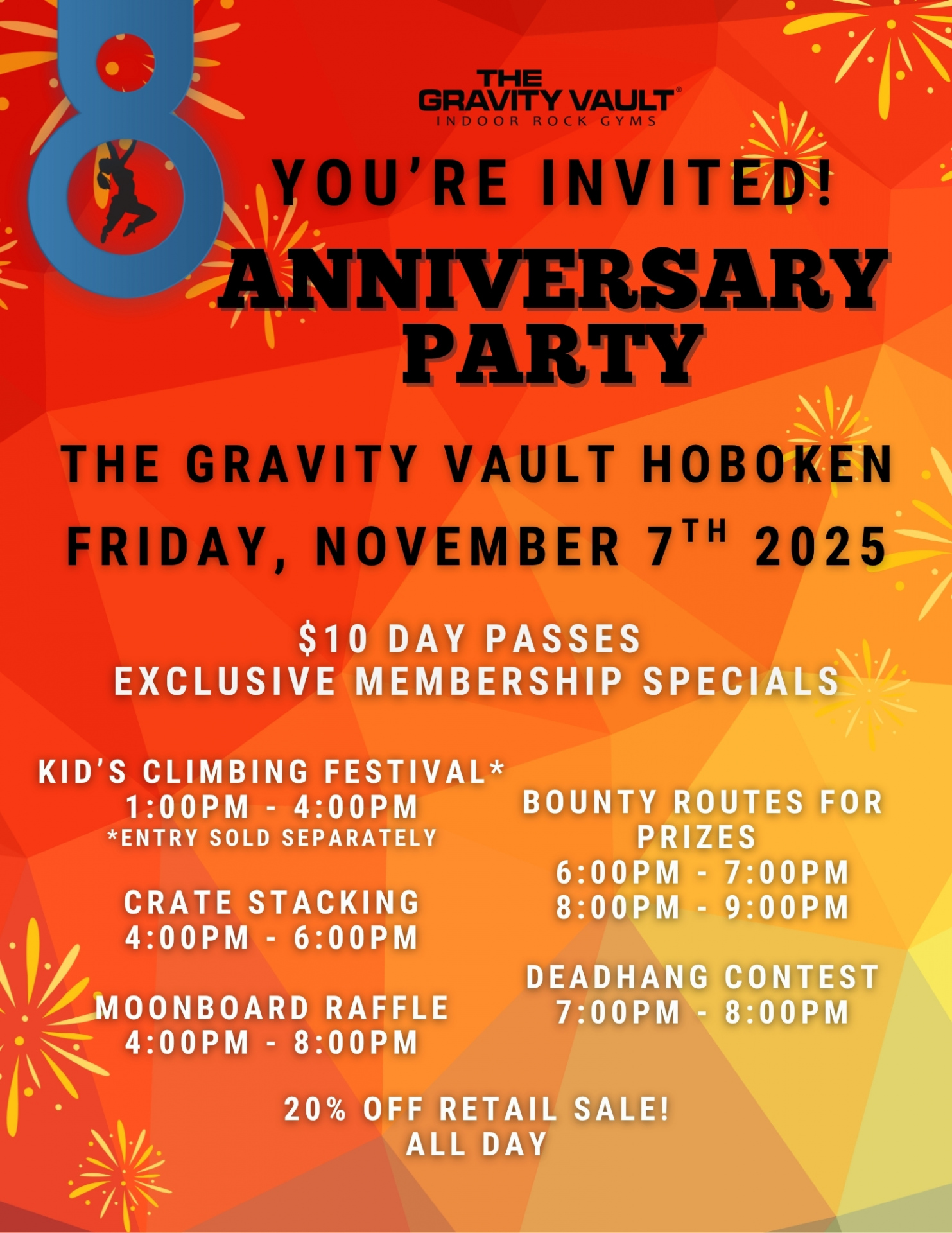 Hoboken, NJ Back to "Hoboken, NJ" Home Bookings & Subscriptions Options to Climb Pricing Calendar Contact Photos Careers Waivers Friday, November 7, 2025 4:00pm ~ 9:00pm 8th anniversary Event! Hoboken, NJ Back to Events