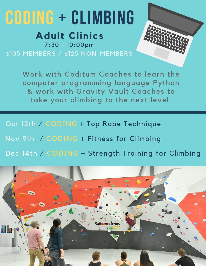 Work with Coditum Coaches to learn the computer programming language Python, and work with Gravity Vault Coaches to take your climbing to the next level.