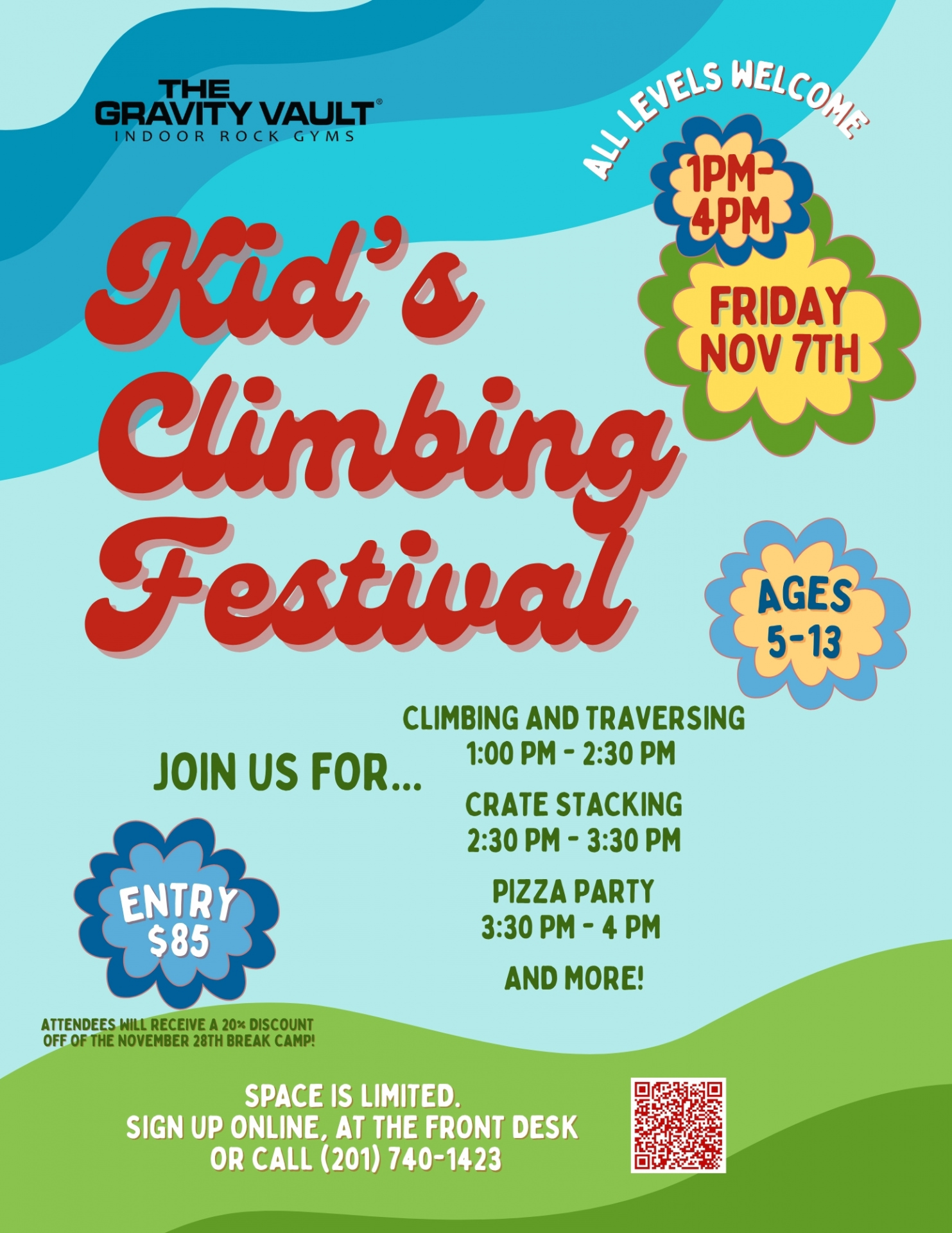 Friday, November 7, 2025 1:00pm ~ 4:00pm Kid's Climbing Festival Hoboken, NJ Click here to register! Back to Events