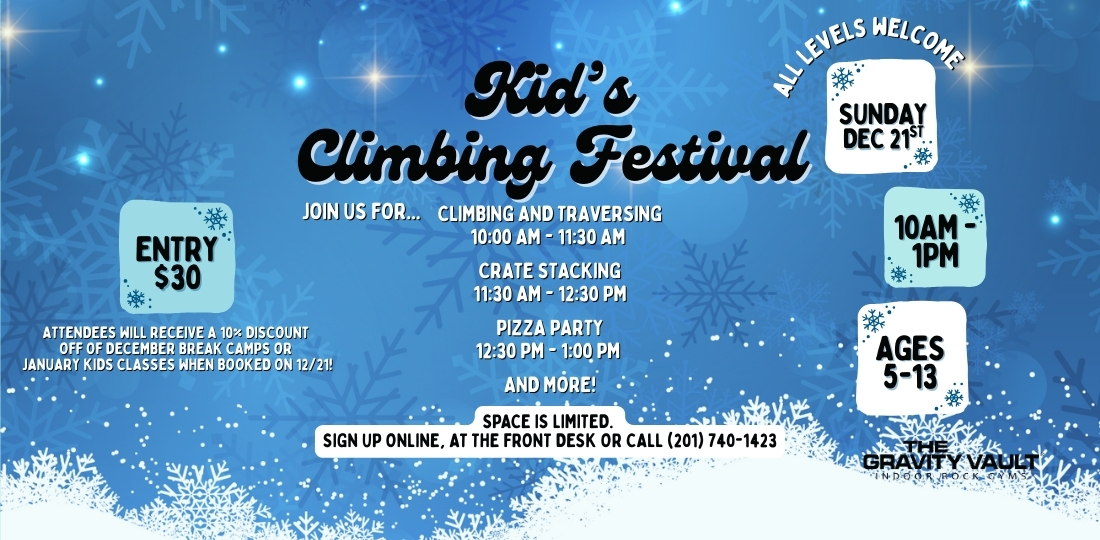 Sunday, December 21, 2025 10:00am ~ 1:00pm Kid's Climbing Festival Hoboken, NJ Click here to register Back to Events