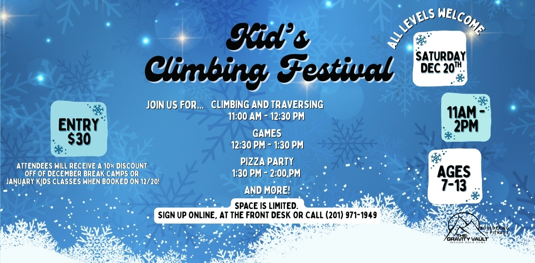 Attendees will recieve a 10% discount off other exciting climbing classes and camps like our Winter Break Camps or our next session of Kids' Classes beginning in January!
