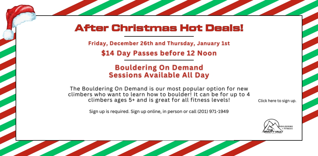 Thursday, January 1, 2026 9:00am ~ 12:00pm New Year's Day Specials! Jersey City, NJ Reserve your Bouldering On Demand Session Here Back to Events
