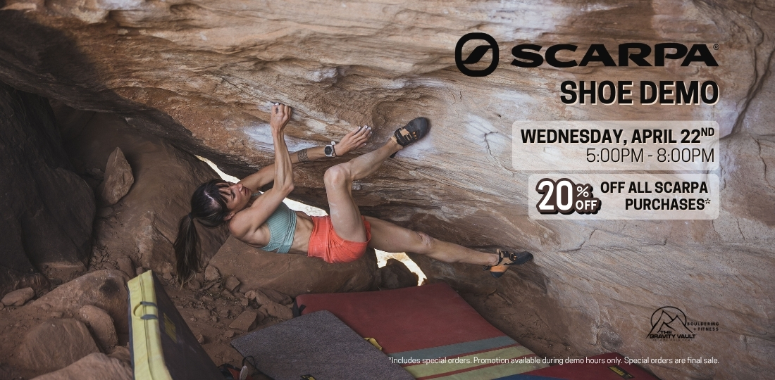 Then join us on Wednesday April 22nd from 5-8pm for our Scarpa shoe demo! Talk to a brand representative, try on styles like the Instincts, Instinct VS, Dragos & Veloces, and find your next favorite pair of shoes!