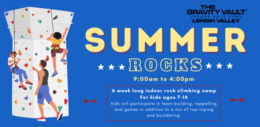 Lehigh Valley, PA Back to "Lehigh Valley, PA" Home Book Now Options to Climb Pricing Calendar Contact Careers Waivers Monday, June 22, 2026 9:00am ~ 4:00pm Summer Rocks 2026 (Week 1) Lehigh Valley, PA Sign Up! Back to Events