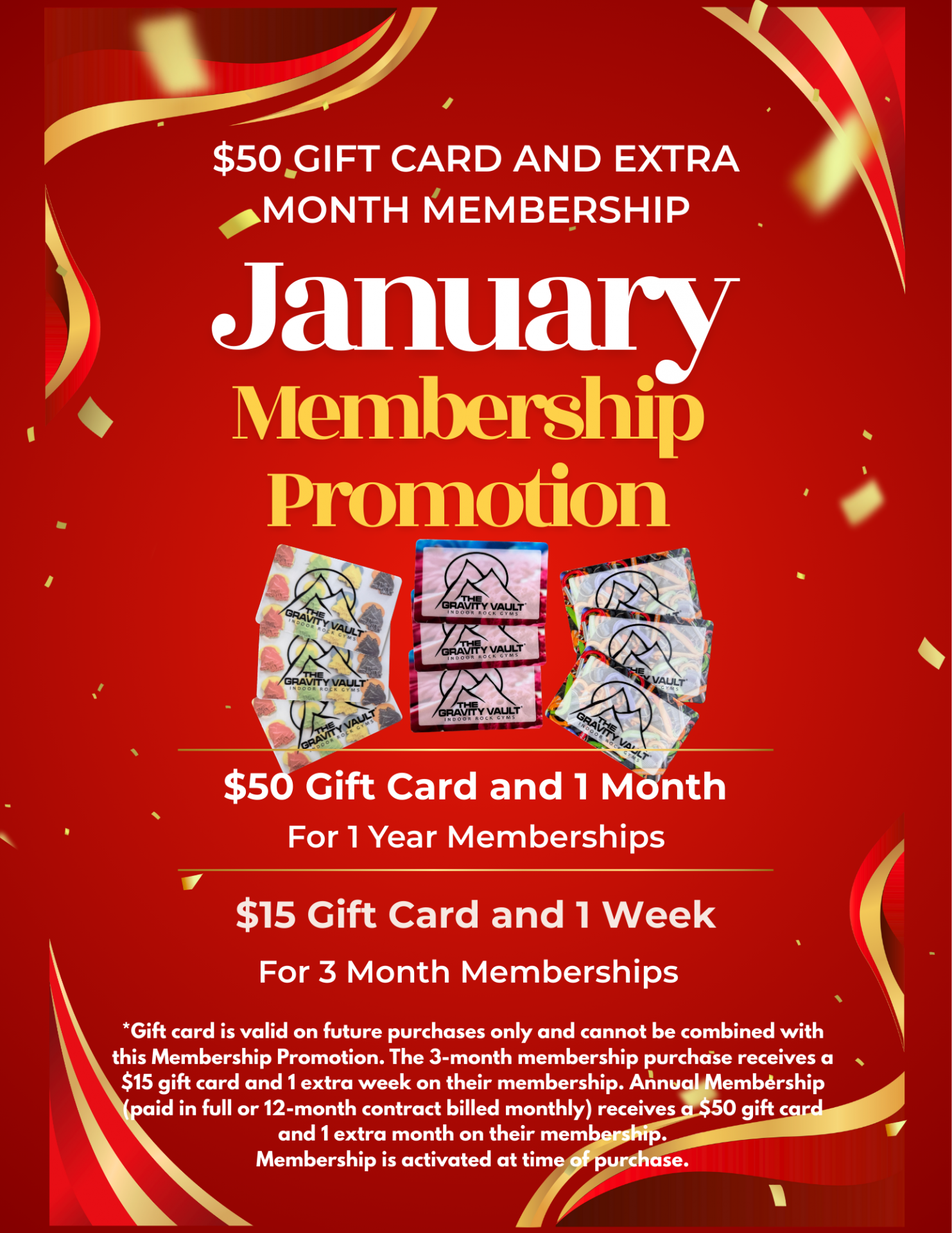 Now through January 31st 2026, purchase a Annual PIF or Annual Billed Monthly Membership and receive and $50 Gravity Vault Gift Card and 1 extra month added to your membership! This is up to a $139 value!!