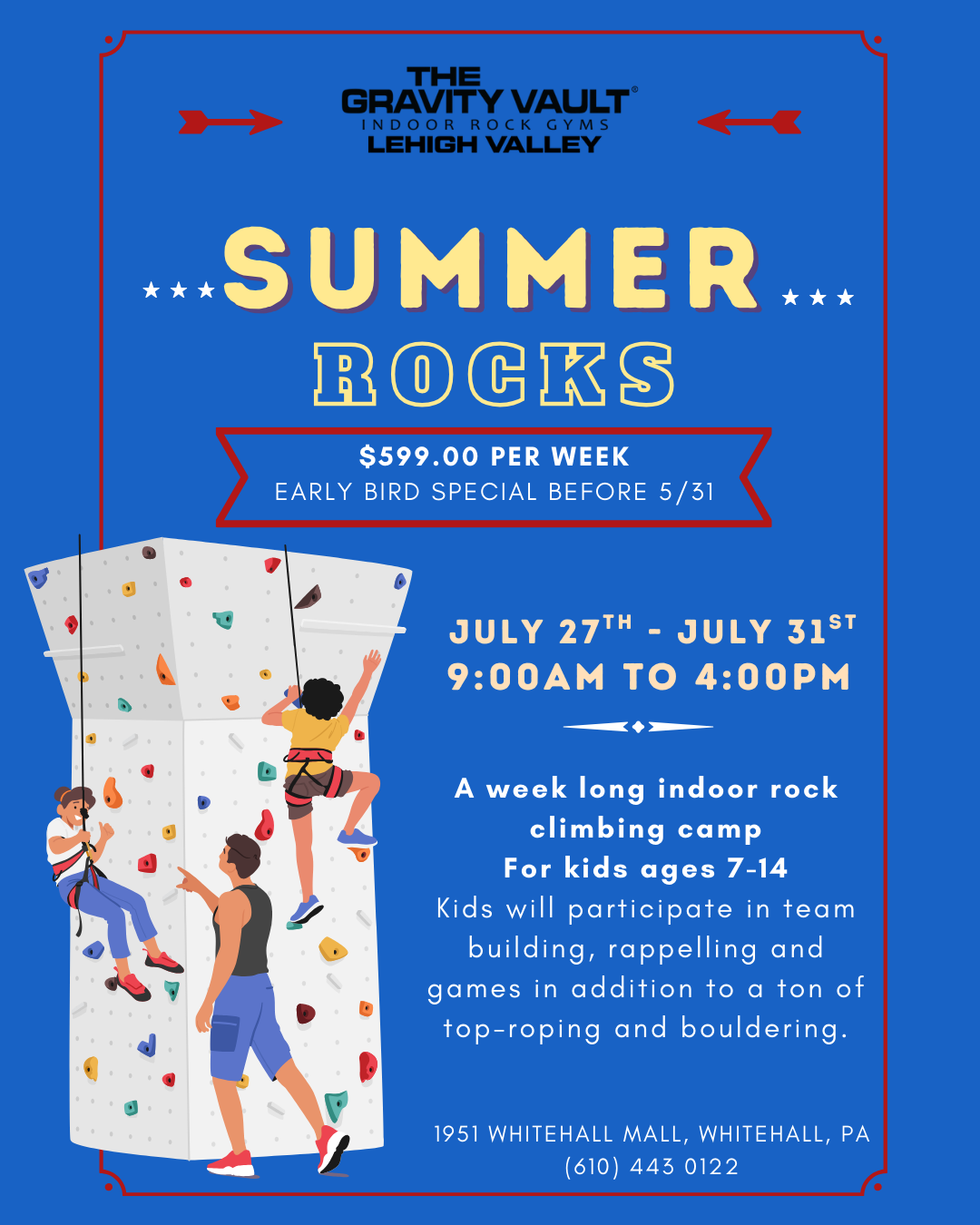 Lehigh Valley, PA Back to "Lehigh Valley, PA" Home Book Now Options to Climb Pricing Calendar Contact Careers Waivers Monday, July 27, 2026 9:00am ~ 4:00pm Summer Rocks Lehigh Valley, PA Sign Up! Back to Events