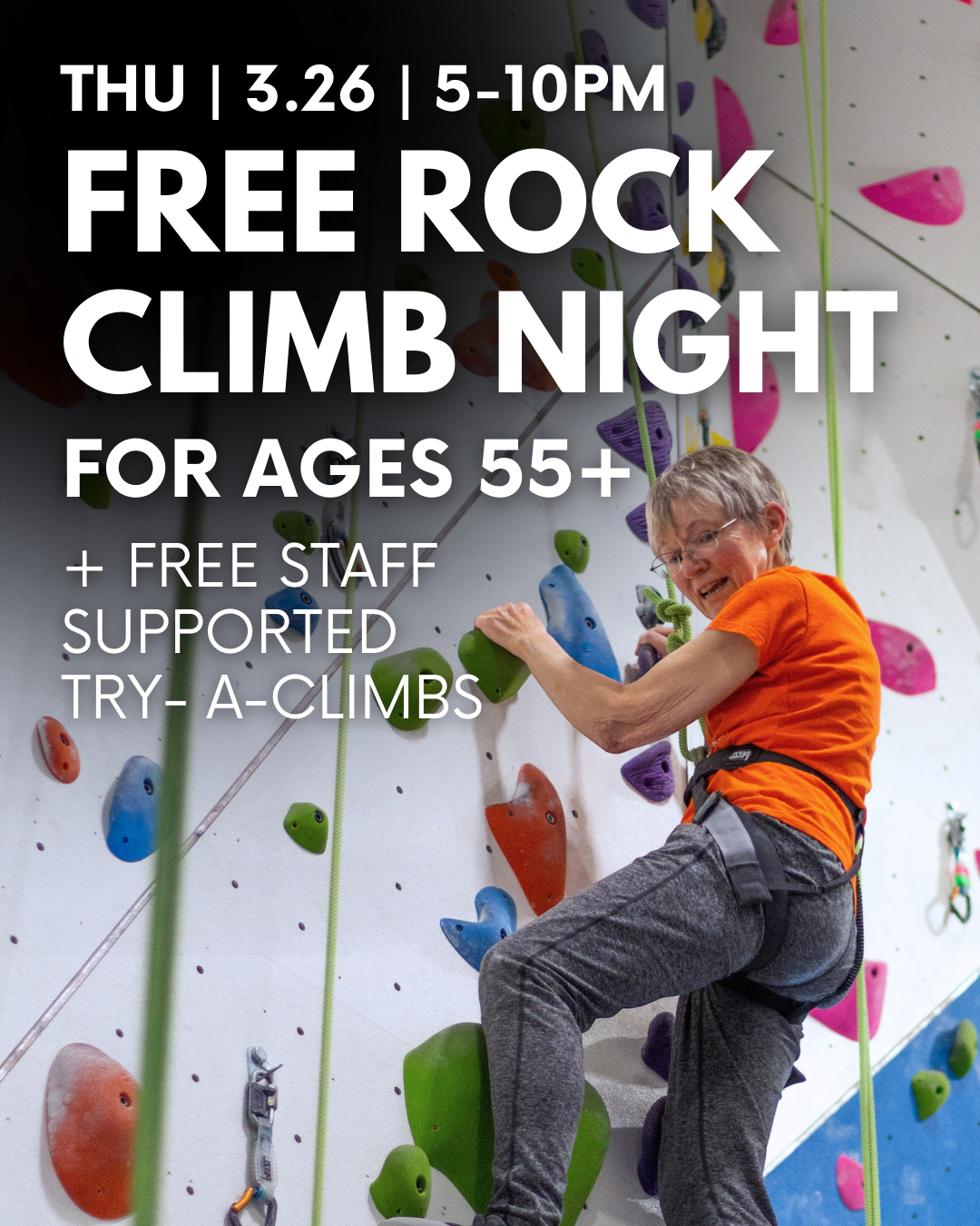 Think you're too old to try climbing? Think again! Our Free Climb Night for Ages 55+ is the perfect chance to give it a try!