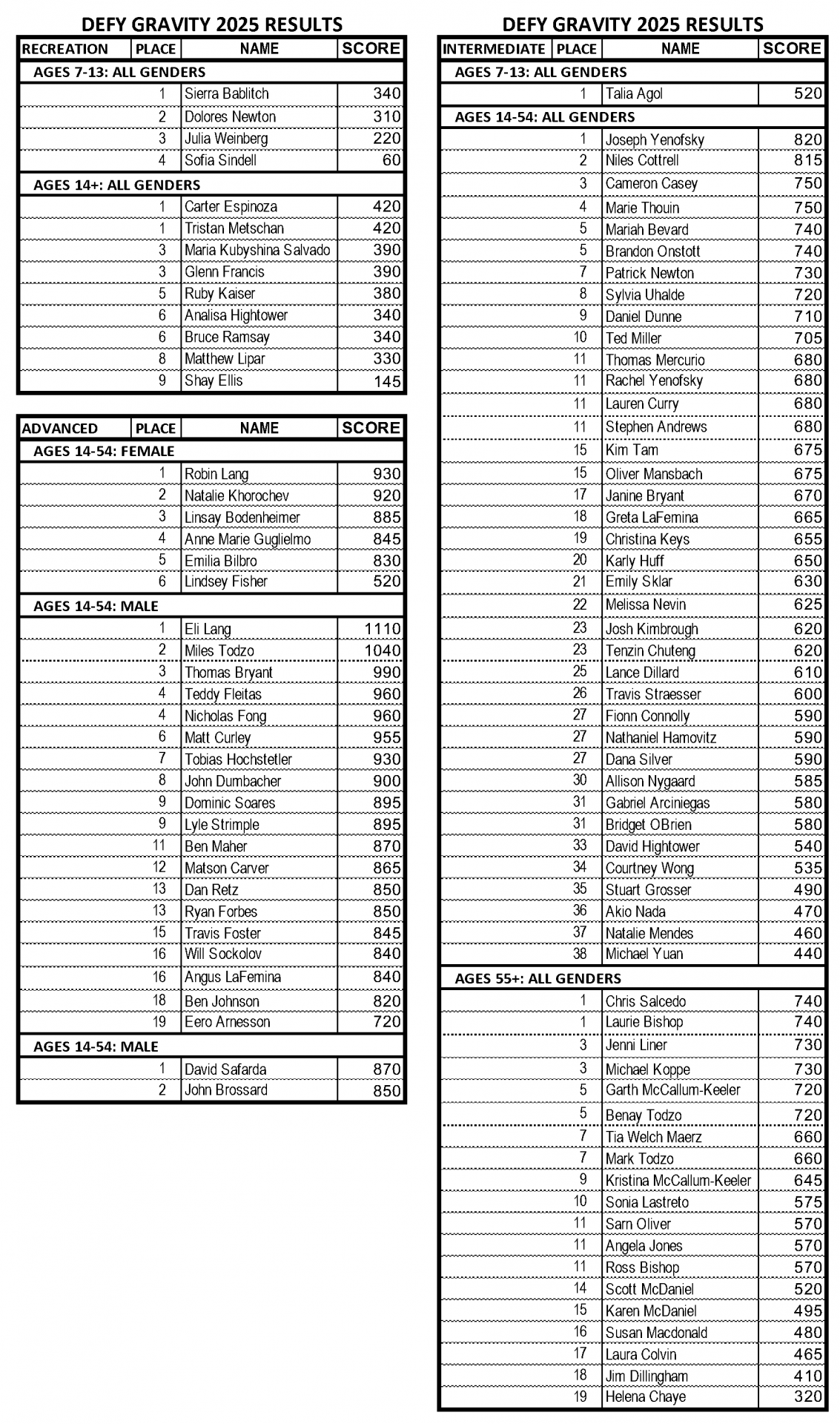 A huge thank-you to everyone who joined us for the 4th Annual Defy Gravity Top Rope Comp! It was incredible watching climbers of all ages tackle 30 brand-new, exciting routes. Whether you were pushing your limits or cheering from the ground, your energy and dedication made this event unforgettable!