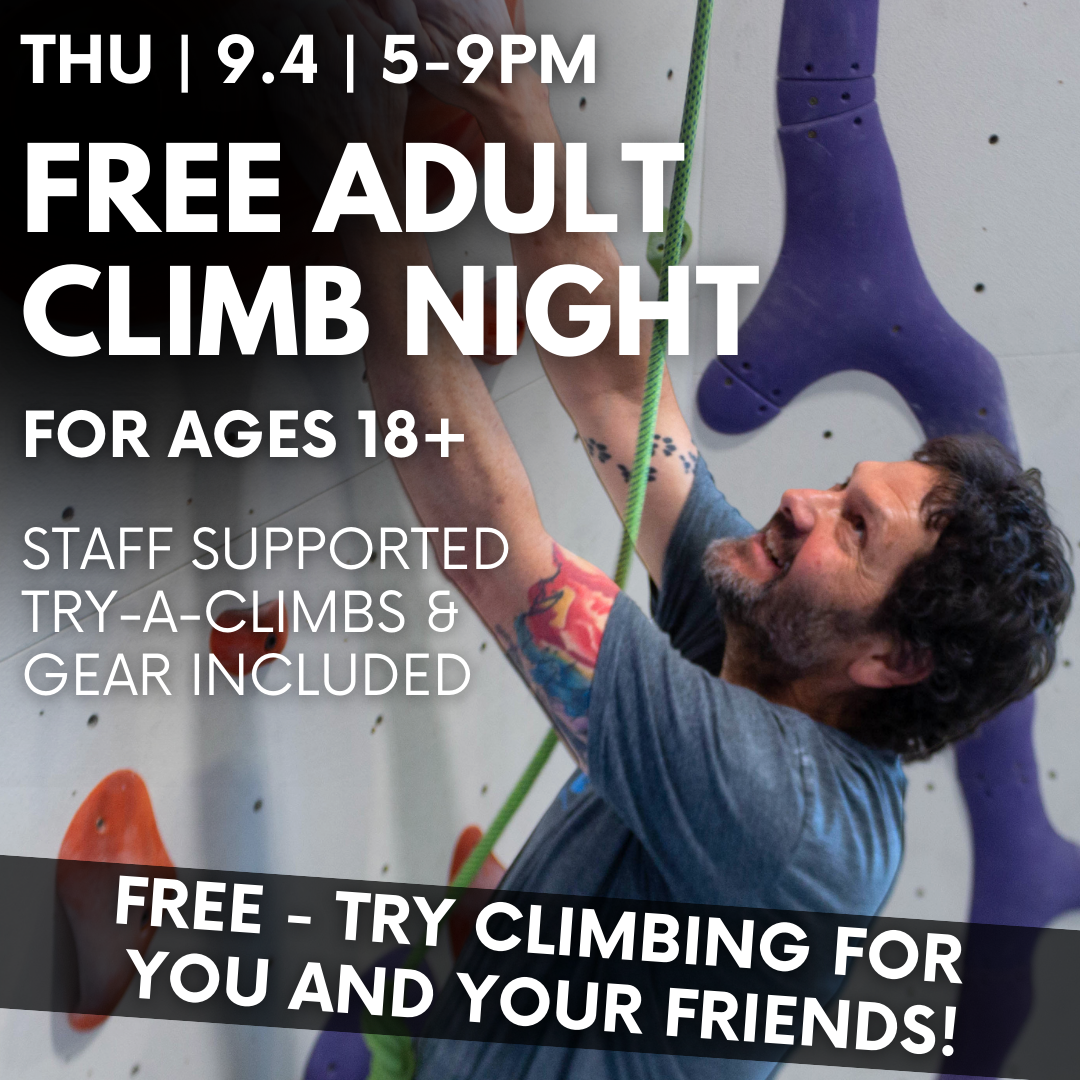 Join us for Free Climb Night on Thursday, September 4th, 5–9 PM (Ages 18+).