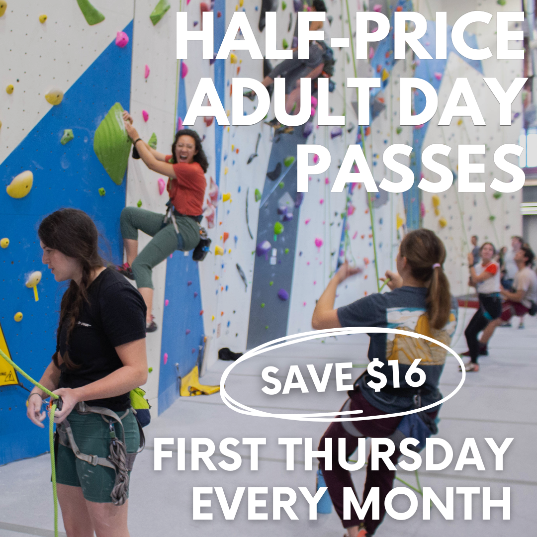 Marin County, CA Back to "Marin County, CA" Home Options to Climb Pricing Hours Calendar Contact Careers Waivers Thursday, March 5, 2026 Half-Price Adult Day Passes Marin County, CA Adult Day Passes are HALF OFF every first thursday of the month. Only $16 Back to Events