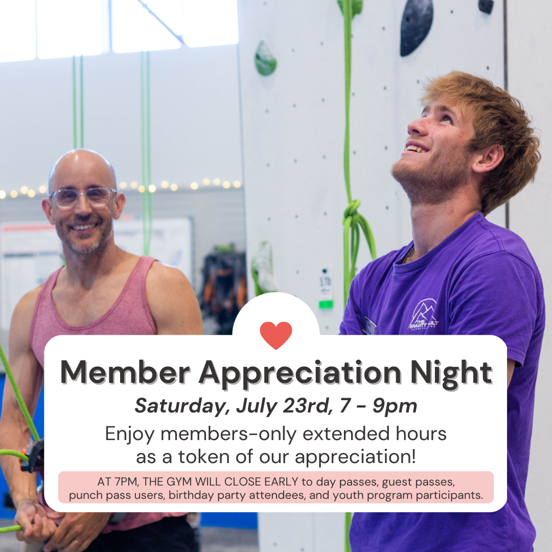Please join us on Saturday, July 23rd for extended and exclusive hours from 7-9 pm for members-only climbing!