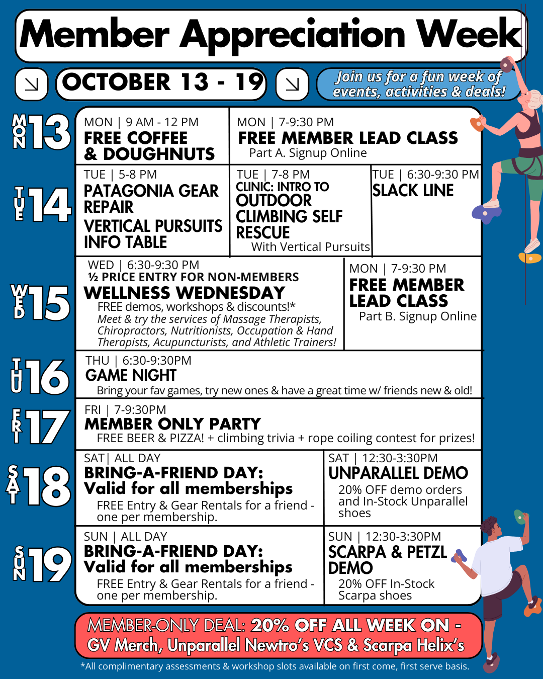 - Ready to unlock your fullest climbing potential? Or perhaps recovering from an injury and need support to get back on the wall? Don’t miss out on this incredible opportunity to meet local health and wellness professionals, here to take your climbing to the next level, with an assortment of free demos, workshops, and member-exclusive deals for their services!