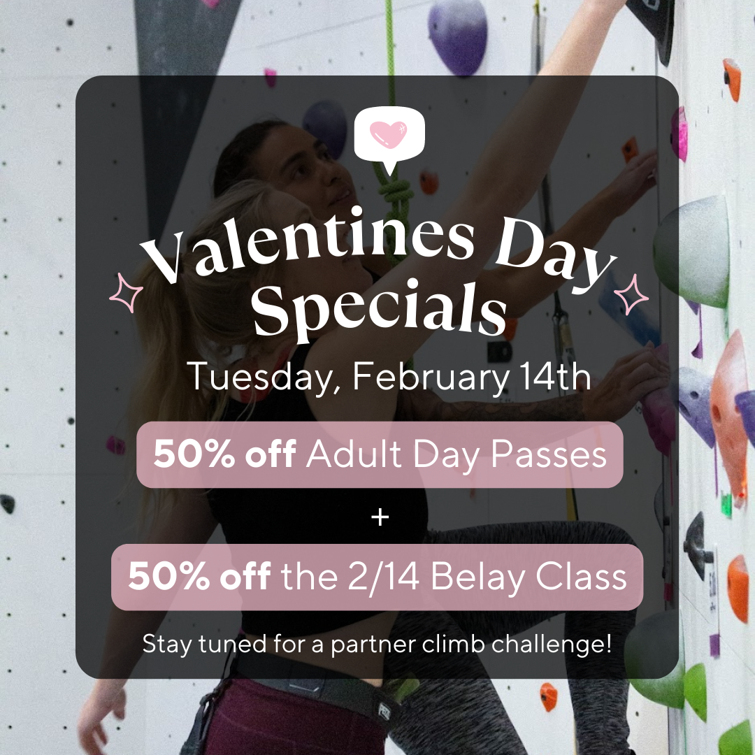 (50% off Adult Day Passes and the 2/14 Belay class specials are only valid on 2/14/23.)