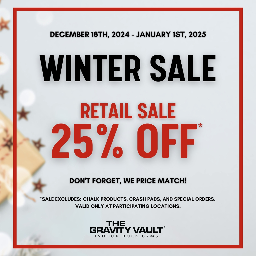 Wednesday, December 18, 2024 Winter Retail Sale Montclair, NJ *applicable to full price items only *excluds crashpads, chalk, food & beverages Back to Events