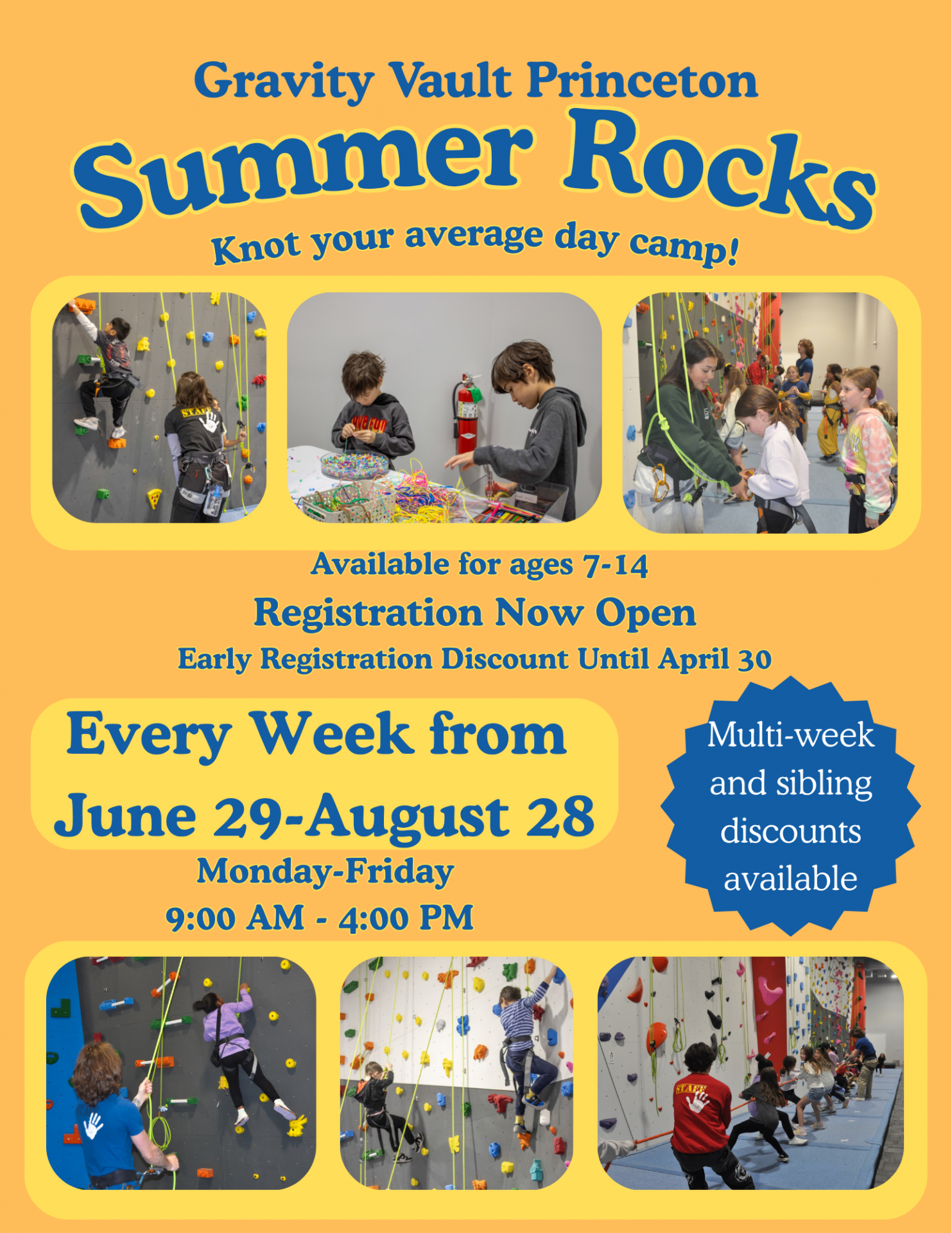 We want your child to enjoy a great week of climbing summer camp, but understand that things happen. We will do what we can to reschedule your registration for another week or credit towards another service with applicable fees below. Should a cancellation be required, additional fees or loss of registration apply. Please review and keep in mind the Reschedule and Cancellation Policies below prior to registration. All Reschedule or Cancellation requests must be made in writing to princeton@gravityvault.com