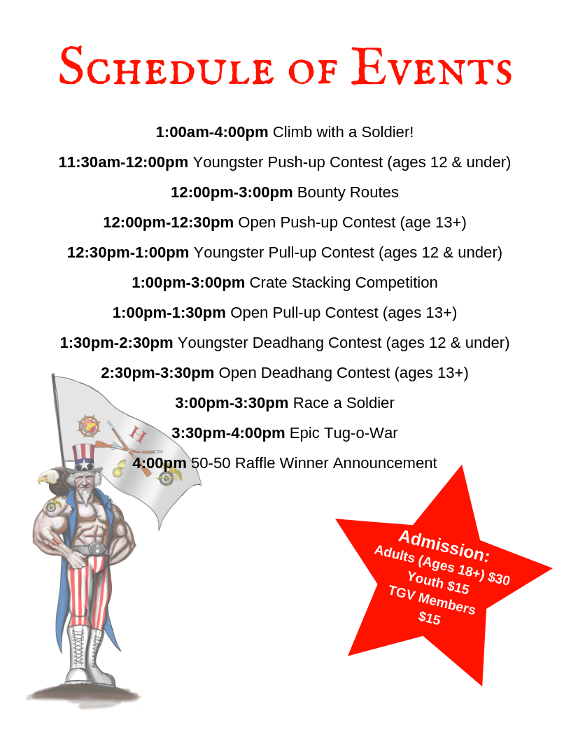 In January of 2019 the 2nd of the 113th Infantry Battalion along with its support unit, Hotel Company, will be depolying to Africa. Deployments can be very hard on Soldiers and their families alike. Funds raised by the Red, White & CLIMB! event will be used to provide support for soldiers and their families in time of crisis, deliver care packages to soldiers overseas, help with a family reintegration ceremony upon return home and much more. This event is a guarenteed to be a day of fun for the whole family! We hope to see you there! RSVP and receieve updates through our Facebook Event Page.